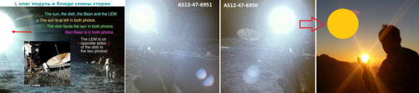 А фотография AS12-48-7133 сделана намного позже, когда Солнце на лунном небе изменило направление освещения. Джек не внимательно читал сказки НАСА о своих полетах и не смотрел даты этих фотографий. В этой ситуации обманщики сверяли угол освещения прожектора киноплощадки с углом освещения Солнца на реальной лунной поверхности. Ошибки они в этом случае не совершили. Джек Вайт тратил свое время и свои умственные ресурсы часто впустую. Он сосредоточился на идее, которая ему понравилась, но которая ничего не давало в деле разоблачения американского обмана. Например, исследование фотографий с разными углами освещения Джек считал эффективным и указывал на «аномалию» разного направления освещения и разных теней. Эту «аномалию» легко объясняли защитники Лунного тем, что одна фотография сделана в первый день пребывания на «луне», вторая фотография сделана на второй день, когда угол нахождения Солнца над горизонтом изменилось. Между тем, на исследуемой фотографии было изображение «Солнца», которое на фоне человеческих фигур имело аномально большой диаметр. Аналогичные фотографии НАСА AS12-47-6950, AS12-47-6951. Чтобы понять нелепость такой картины, с таким огромным «Солнцем», необходимо поискать изображение реального Солнца с фигурами реального человека. Такая фотография нашлась. Она находится справа, и подходит для указанного сравнения с кадрами 6950, 6951 по параметрам роста фигуры и расстояния от него до фотографа.