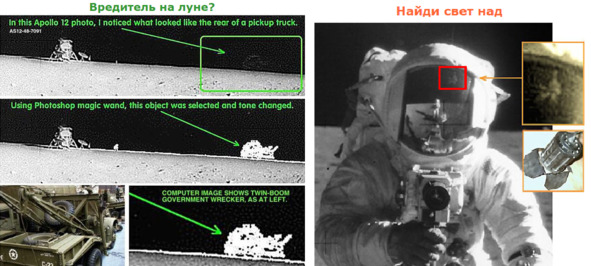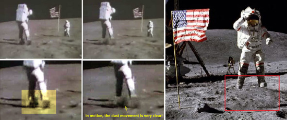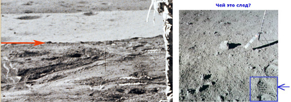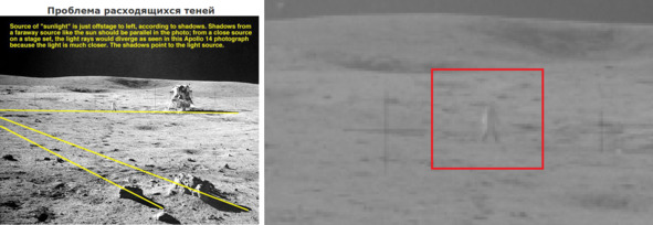 Около камней сделали на грунте впадины слева. «Разрушители» сильно радовались. Про фигурку «космонавта» они забыли. Чтобы она не падала, им бы, наверное, тоже пришлось у куклы широко раздвигать ей ноги. Неестественная поза, которая не характерна для расположения ног у живого человека, сразу же привлекла внимание многих критиков американского обмана. Характерно, что куклу поставили к фотографу спиной. Видимо, это было сделано не случайно. При увеличении фрагмента изображения, вероятно, можно было различить отличия изображения лунного актера вблизи от изображения этой куклы, которая расположена на большем расстоянии от оператора. Обманщики не знали, что появятся технологии увеличения кадров.