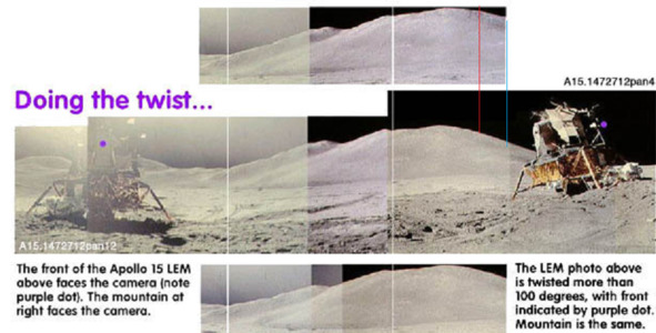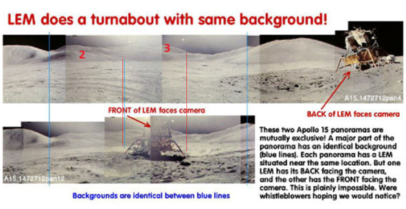 Выводы Вайта, как минимум, не убедительны, и очень спорны. Авторы сайта разделяют заблуждение Вайта в отношении этого сравнения: «Комментарии редактора: 1. Вывод должен состоять в том, что либо ЛМ был перемещен, либо фоны были перемещены, либо и то, и другое». [6] Этот вывод сделан из предположения об использовании одинаковых фонов в разных ситуациях. На следующих панорамах НАСА Джек пытается сравнить изображение «ЛМ», которое, по его мнению, на разных фотографиях, по разному ориентировано к элементам заднего плана. «LM does turnabout with some background» – LM делает поворот с некоторым фоном. Вторая фотография снималась фотографом в песочнице с объемными макетами гор со смещением вправо от первой позиции. И гора 2 вдруг стала короче. Это малозаметно, но изменение есть. Гора 3 в нижней фотографии точно стала короче. Проекция изображения этих гор на плоскую поверхность фотографии изменила свои размеры. Джек же исходит из ложной предпосылки, что задний план сравниваемых фотографий не изменился. И берет только две крайние точки панорамы, которые, по его мнению, совпадают. Некорректная подгонка увеличенных фрагментов фотографий не смогла оставить задний фон двух панорам неизменной.