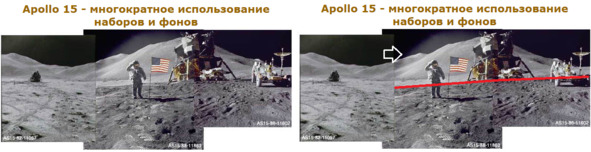 Подобные ошибки Джек допускает и в других сравнениях. Они очень спорные и некорректные. Если хорошо присмотреться, задний фон меняется. Джек настаивает, в этих сравнениях, что задний фон не менялся. Аналогичная ошибка Джека на изображении сравнения двух фотографий НАСА, выше. Подгонка двух точек плоского изображения и утверждение, что задний фон не изменился. На самом деле изменения есть, и они хорошо видны. Никакого перемещения макета «ЛМ» в песочнице НАСА не выполнялось. В этом не было необходимости. Фотограф НАСА обходил большую площадку с макетами «ЛМ» и куклами и фотографировал дальние планы «Луны». Фальсификаторы понимали, что фотографирование нельзя делать с изменением ориентации «ЛМ» и направлением освещения площадки прожектором. При съемках ближнего плана с участием живых актеров позади сцены выставлялся «рир-экран». Его наличие выдавало три основных признака: 1) Между грунтом киностудии и фоном экрана образовывалась заметная граница, раздел между почвой и экраном; 2) На экране при освещении дополнительных осветительных приборах в киностудии образовывались световые ореолы или тени; 3) Контрастность объектов ближнего плана была такой же как у объектов дальнего плана.