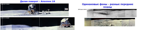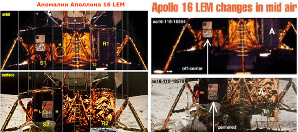 Это очень хорошо видно на примере рельефа посредине двух линий, которые провел Джек, на панораме НАСА слева. Холмы на двух фотографиях все равно немного отличаются. На панораме слева холмы на двух сравниваемых фотографиях НАСА, сразу справа от линии Джека имеют разную протяженность. Джек опять не учел изменение заднего плана, которое очевидно, между двумя «контрольными» линиями, которые он установил. Его вывод базируется на неизменности фона в разных ситуациях, зафиксированных на фотографии, сделанных с разных направлений. Но этот момент в аргументе Джека не соответствует реальности. Задние фоны имеют плохо различимые различия, они не одинаковые. Более реальные аномалии Вайт обнаружил в шоу «Аполлон-16» при сравнении «ЛМ» на фотографиях этого объекта в «космосе» и на «Луне». Здесь действительно обнаружились существенные различия. Придумать оправдание такому изменению внешнего вида можно. Но на этот раз отговорки, типа такой, что «космонавты навешали, например, слева темную ткань сверху фольги, будет не убедительной! Изменение вида справа от лестницы, изменение внешнего вида фольги, можно как-то оправдать более реалистичными аргументами, например, фольга смялась при «прилунении», справа была накладная конструкция, которую потом убрали. Но с левой стороной от лестницы у фальсификаторов вышла серьезная и заметная оплошность.