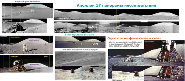 В шоу «Аполлон-17» Джек опять пытался найти аномалии, связанные с использованием одного фона в разных ситуациях фотографирования, несоответствия размеров «ЛМ» и макет гор, изображенных на заднем плане. Аномалии, обнаруженные Джеком, в этом случае тоже не убеждают в реальности аргументации Вайта. Их можно объяснить проекционными искажениями, неправильным толкованием однородности задних фонов, которые на самом деле имеют плохо различимые отличия. Вайт не понимал, что при изменении ситуации на ближнем плане, фоновые объекты на фотографию изменяются значительно меньше. При близком фотографировании, например, «ЛМ» задняя гора может предстать очень маленьким объектом. И наоборот при дальнем фотографировании макета «ЛМ» на фоне макетов гор, в песочнице, гора может предстать большой, «ЛМ» маленькой. Не было смены декораций или реальной местности, а такое тоже могли применить фальсификаторы. Отсюда заблуждения Вайта о смене декорации задних фонов. Например, на панораме НАСА «Аполлон-17», на фотографии внизу второй холм, справа от линии Джека, значительно ниже, чем аналогичный холм на верхней фотографии. На фотографии Джека «Горный фон тянется?» стандартная ситуация фотографирования макета горы в песочнице с разных направлений.