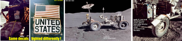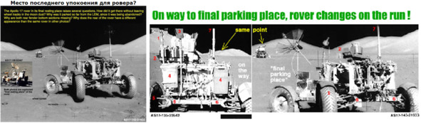 Реальные аномалии в этой серии «Аполлон-17» Джеку тоже удалось обнаружить. Это пример использование скотча для закрепления на поверхности «ЛМ» флага США и таблички «UNITED STATES». Скотч не лучшее средство для удержания таких вещей при аномальных температурах в космосе от +170 градусов Цельсия до -170. Джек обнаружил несколько изображений «луной телеги» США, которые рядом не имели следов от колес. Защитники лунного обмана придумали версию о том, что следы засыпали «космонавты» при своей беготне. Вторая дополнительная версия от мифического пропагандиста США Джея Виндли, основателя сайта «Клавиус», состоит в том, что эту конструкцию «космонавты» носили на руках. Ремонт крыла над колесом «лунной телеги» с помощью скотча. Это забавное «конструкторское» решение! Такая «лунная телега» США в действительности по липкому лунному грунту, с большим количеством мелкого щебня, в условиях вакуума ездить с такими подкрылками не смогла бы. Между подкрылками и колесом образовалась бы «пробка» и колесо бы не смогло вращаться. На Луноходе никакого прикрытия колес не предусматривалось. Подобные приспособления создают проблемы.