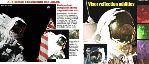 Джек обнаружил отражение человека в зеркальном стекле гермошлема на фотографии НАСА AS17-134-20384 в нижней части «зеркала». Создается такое впечатление, что этот человек, предположительно фотограф находится на уровне значительно ниже, чем «космонавт», которого фотографируют. Что не исключено. Для получения эффектного кадра американские фальсификаторы могли поместить «космонавта» с флагом на подъемный механизм и сфотографировать его снизу. Либо это следствие неправильного монтажа изображения второго «космонавта» и «ЛМ» в зеркальное стекло. Потому, что в этом стекле на самом деле отразилась киностудия НАСА.
