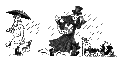 Растворились, сгинули в осеннем тумане, иссеченном дождем, белые десятиэтажные здания, и различались лишь промокшие до черноты деревянные строения вдоль горбатой улочки, затопленной жидкой грязью, по краю которой, держась за заборы, пробирались прохожие в просторных, до пят, плащах и широкополых шляпах. Проехал извозчик на мокрой кляче…