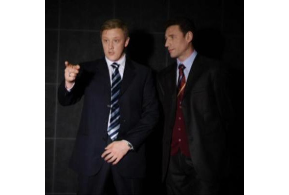 Рис. 19. На фото: кинопроба двух примерно одинаковых по биоданным и медийности актеров. Виталий Абдулов (справа) и Сергей Горобченко. Режиссер Андрей Ангелов за кадром.