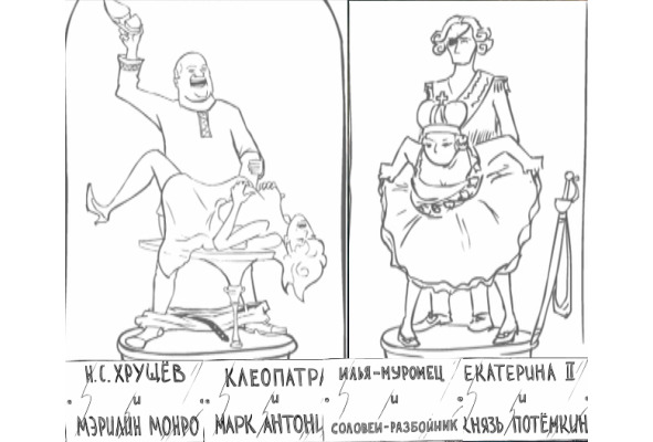 Выдержка из экспликации художника: «Стриптиз-клуб. По одной стороне стоят 4 статуи известных ист. персонажей, в пикантных позах. Между статуями три двери – ведущие в приват-комнаты. Все оформлено дорого и со вкусом.