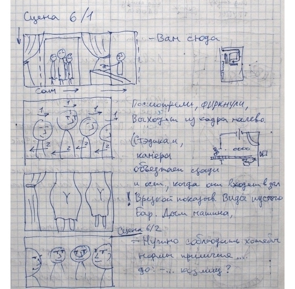 Идеально, когда раскадровка рисуется под конкретные локации. Но на практике такого почти не бывает и раскадровку рисуют как раз параллельно с поиском объектов. А потом подгоняют её под уже конкретные помещения. По ходу изготовления раскадровки режиссер с оператором выезжают на места будущих съемок, фотографируют их.
