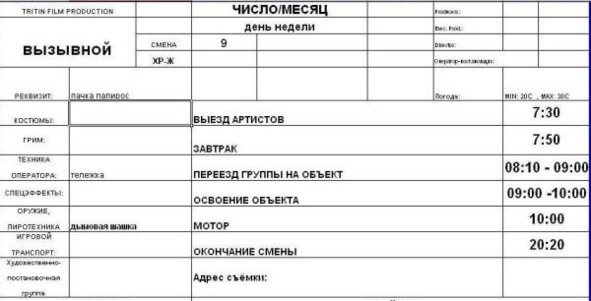 Вызывной лист – это КПП, расписанный на каждый день. Здесь подробно описывается, что, когда и за чем будет происходить на съемочной площадке. Кто именно будет тут, и для чего. С точностью до минуты! Каждый член съемочной группы и каждый актер получает такой лист накануне вечером. Читать вызывной лист надо уметь, не говоря о «составлять».