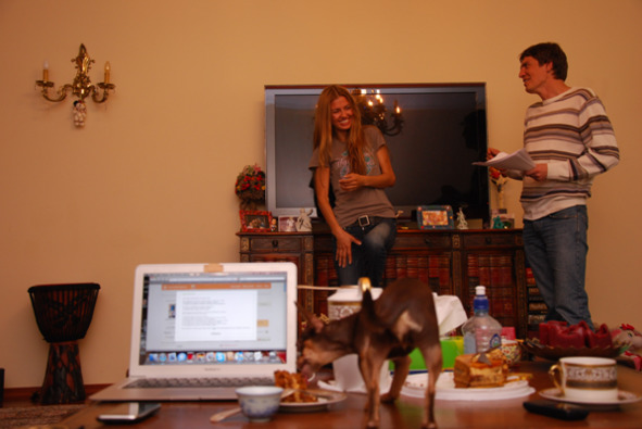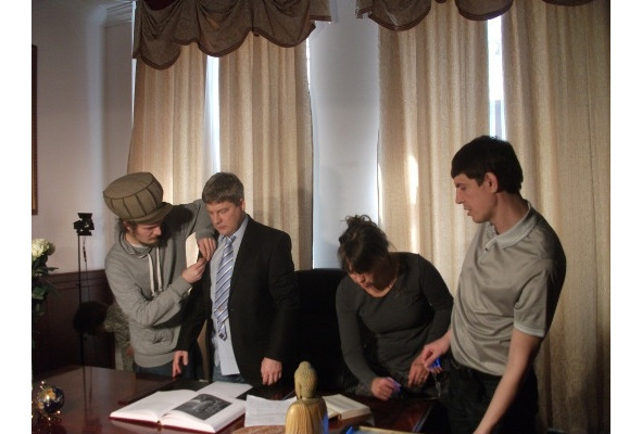 – 50 человек киногруппы + актеры вынуждены тесниться в узенькой комнатке 3-хкомнатной квартиры, где в одной комнате снимают, а другая оборудована под гримерку-переодевалку. Куча проводов, приборов и духота!