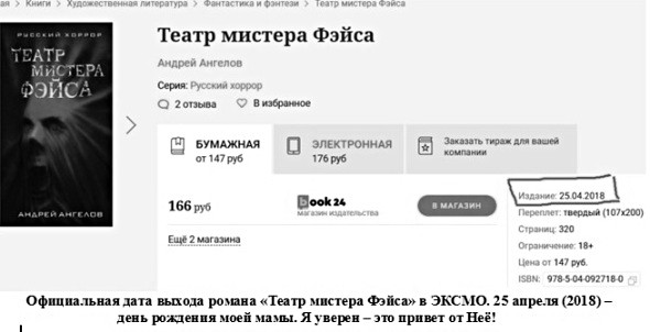 После смерти мамы – наши с женой дела как-то незаметно пошли в гору. Как в денежном плане, так и в творческом. А роман, мой главный труд, – тот труд, что и привёл меня в Москву, – а именно роман «Театр мистера Фэйса» официально вышел в ЭКСМО 25 апреля, – в день рождения моей мамы. Родилась она на Пасху, к слову, в тот год 25 апреля была Пасха. И никто цифру специально «не подгонял».