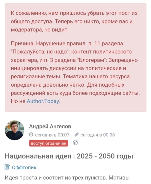 Рис. 1. Забаненный пост автора на АТ (Author Today). Те самые строки, что ниже.