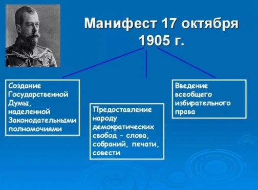 Было заявлено множество свобод. От окончательного освобождения крестьян от барина – до создания целой Госдумы, как законодательного органа, что ограничивал власть императора и кабинета министров.