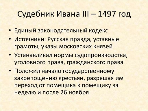 Поэтому, по приказу тогдашнего Верховного – Ивана III – был разработан Судебник или вторая Конституция.