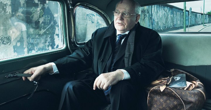 Рис. 10. Горбачёв. Кадр из рекламы фирмы «Луи Виттон». Да, Михаил Сергеевич иногда снимался в рекламе, после руководства страной. Мотив банален: нужны деньги. 1990-е – время гиперинфляции и 2-х мощных экономических кризисов: один привёл к залоговым аукционам*; второй – к дефолту**.