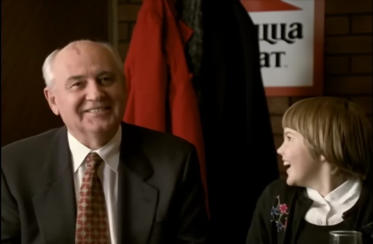 Рис. 11. Экс-президент в рекламе «Пицца Хат», вместе с внучкой Настей. Горби страну не продал, поскольку дивиденды в карман не положил. В рекламе, в возрасте 60+ лет, – от хорошей жизни сниматься не будешь. Если ты не актёр.