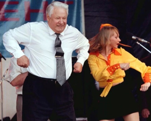 Рис. 13. «Ельцин – наш президент!». Борис Николаевич лихо отплясывает в период своей предвыборной кампании. Ему здесь: 65 лет.