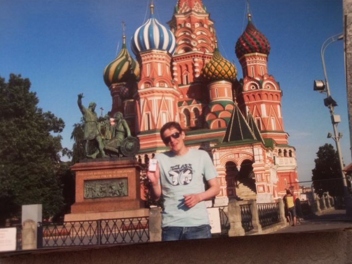 Рис. 6. Красная площадь, Москва. Храм Василия Блаженного + памятник Минину и Пожарскому. Позирует: Ангелов, в руках пачка «Winston». Идея такого «художественного решения» – странная, на авторский взгляд из 2024 года.