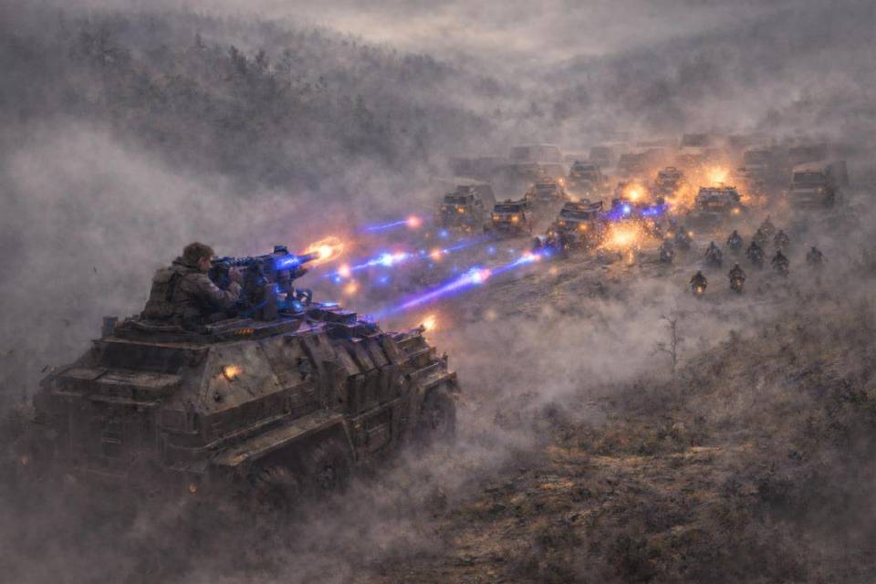 Снаряды врезались в скопления фигур, превращая их в месиво. Пули добивали тех, кто пытался отползти к кювету или спрятаться за борт перевёрнутого грузовика. Пара гилларских броневиков успела повернуть башни в сторону третьей роты, но их выстрелы либо уходили в молоко, либо били по лобовой броне, оставляя лишь вмятины и серые подпалины.