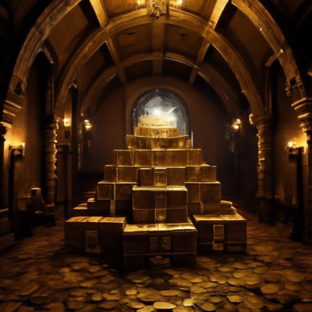 – Берите всё что хотите, – разрешил Алекс и, оставив спутников в коридоре, вступил внутрь небольшого и тёмного хранилища, задействовав системы ночного видения. На потолке был светильник, но он, почему-то не загорелся. Возможно, за сотни лет, магия в нём иссякла. В помещении, вдоль правой и левой стены, тянулись полки полные каких-то неведомых артефактов, ящиков, коробок и плетёных корзин. Вся дальняя стена была скрыта штабелем деревянных ящиков обитых железом. На полу, в центре комнаты, штук сорок прочных сундуков, сложенных пирамидой. Вскрыв один из них, парень обнаружил, что он полон золотых монет.