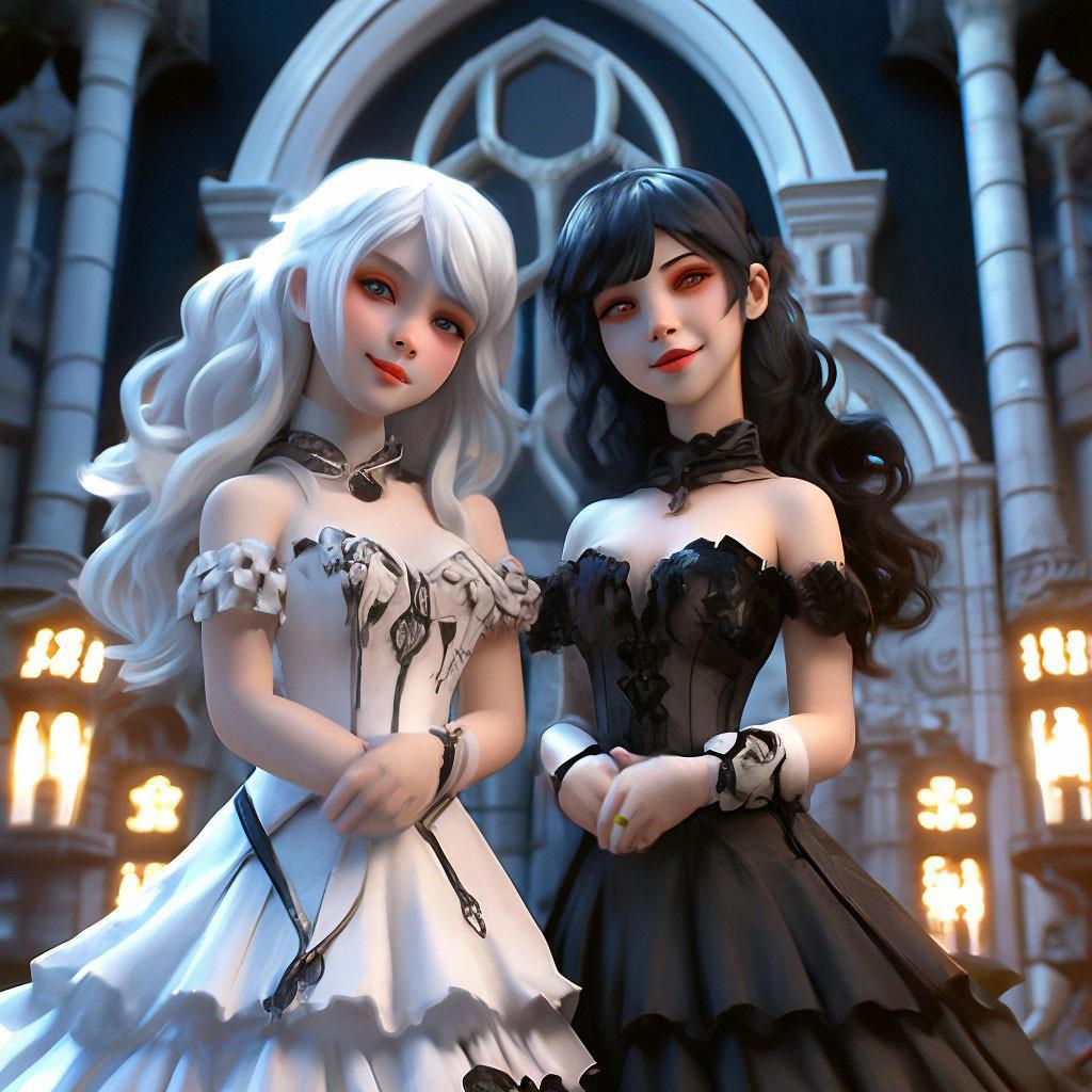 Следом за ней, сразу же, появилась вторая девушка, только в чёрном платье и с чёрными волосами. Радужка её глаз оказалась тёмно-янтарная. В остальном обе девочки выглядели как сёстры близнецы.