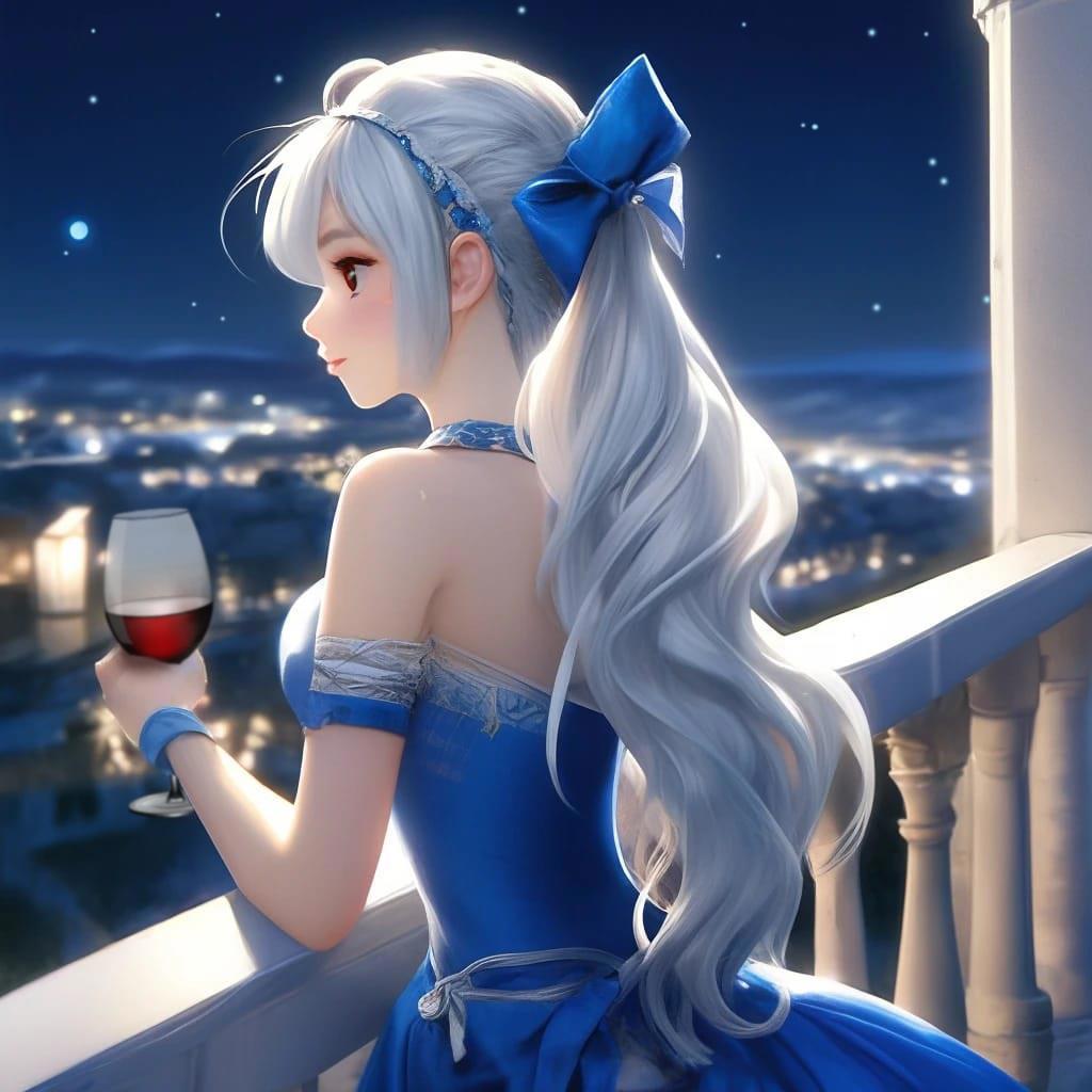 На девушке сейчас было довольно короткое светло-голубое платье с оборками. Ткань тонкая и лёгкая. Плечи и спина открыты. Кроме того, на голове принцессы не было её тиары. Только широкая лента, стягивающая белые волосы в конский хвост пышным бантиком на затылке.