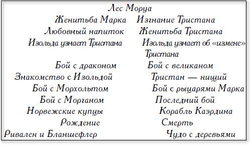 Это стремление к симметрии эпизодов характерно для нашей легенды в целом. Можно было бы насчитать больше симметричных пар. Но из-за того, что мы имеем дело с рядом версий, в которых последовательность эпизодов не строго идентична, их затруднительно расположить на схеме. Да у произведения XII в. и не могло быть столь последовательной и мелочной симметрии; она могла бы быть плодом лишь изощренного умельца, скажем, эпохи барокко или поздней готики, но никак не ранее. В числе таких не вполне симметричных (но несомненно параллельных) эпизодов можно назвать сватание к Изольде сенешаля ирландского короля (сенешаль, как известно, выдает себя за победителя дракона) и ухаживание за корнуэльской королевой Кариадо.