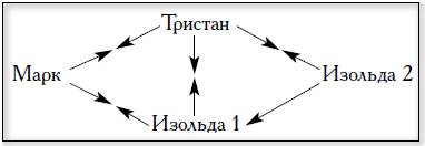 Считается, что Изольда Белорукая – это дублет первой Изольды (так и было в гипотетических кельтских источниках). Думается, в структуре сюжета, центром которого является Тристан, это не так. Ведь взаимоотношения героев можно изобразить следующим образом: