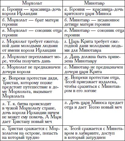Зигмунд Эйснер [128]приводит следующую таблицу соответствий одного из важных эпизодов нашей легенды (бой Тристана с Морхольтом) с не менее важным эпизодом из биографии древнегреческого героя Тесея (победа юноши над чудовищем Минотавром в лабиринте Крита и его любовная связь с дочерью Миноса Ариадной):