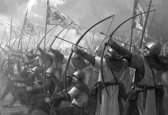Восемь с половиной тысяч воинов ближнего боя, перед которыми шагают три тысячи двести лучников. Вскоре свои позиции на правом фланге заняли полтысячи королевских кавалеристов.