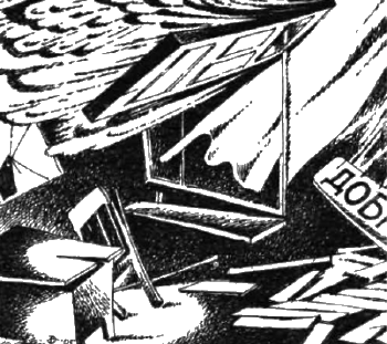 А пока суд да дело, все внутренние двери в конторе, все окна, даже все столы и стулья стали быстро рассыхаться. Был большой грохот, когда начальник, распекая нового столяра, ударил кулаком по столу, а стоп распался. И тут же еще сильнее загрохотало, когда под начальником рассыпалось кресло. В конторе на всех этажах начали скрипеть полы, высунулись шляпки гвоздей, горбами изогнулись плинтуса. стали потрескивать балки перекрытий и даже деревянные линейки покоробились, а цифры на них осыпались. Доска с надписью «Добро пожаловать» упала прямо на начальника конторы.