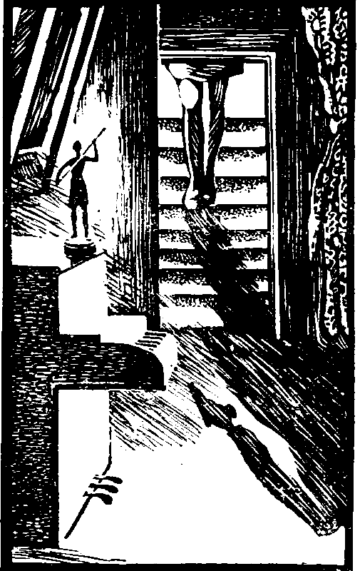 Пуговица падает на пол, храня на себе след пальцев профессора. Хари подбегает к шезлонгу. Там он заранее спрятал портативный магнитофон, на ленту которого предварительно записал типичную для профессора реплику. Он включает магнитофон и бегом спускается по лестнице. Когда повар вернул нас троих обратно, Хари, воспользовавшись удобным моментом, снова прячет магнитофон…