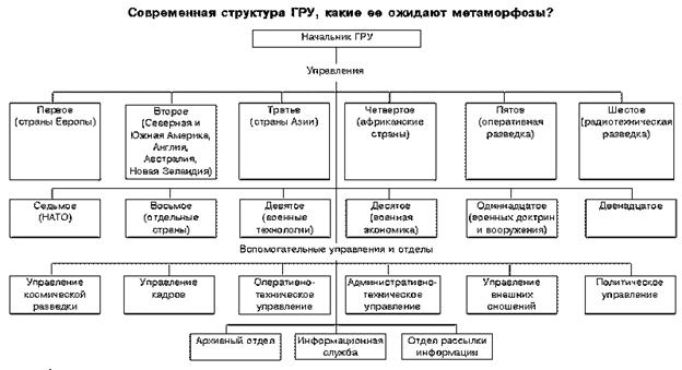 Политическая, военно-организационная и экономическая инфраструктуры обусловливают внешнюю и внутреннюю инфраструктуру спецорганов, что можно проследить на схемах организационной структуры ЦРУ США и ГРУ ГШ ВС СССР.