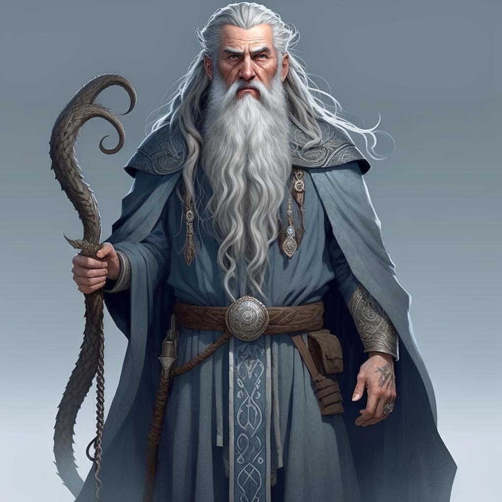 С треском раздвинулись ветви кустов и на берег вышел высокий старик в странном одеянии – будто множество рыболовных сетей, связанных в подобие плаща, с вплетенными между ними лентами сухих водорослей. Все это облачение усеивали морские ракушки, издавшие негромкий перестук с каждым шагом старика. Такие же ракушки, вместе с черепами рыб и высушенными морскими звездами, украшали и седые волосы, что свисали с правой стороны головы множеством тонких кос. Левая же сторона макушки синела свежевыбритой кожей, с небольшими шрамами в разных местах. Узкое костистое лицо обрамляла всклоченная седая борода, также завитая в несколько кос. Временами причудливое одеяние распахивалось, обнажая на белом, как у утопленника, пролежавшем несколько дней в воде, тощем теле ярко-синюю татуировку, в виде диковинной твари, напоминающей одновременно змея и спрута, оплетшего своими щупальцами грудь, плечи, живот, руки и ноги старца. Талию охватывал некрепко держащийся пояс, с которого свисал золотой серп. Серебристая же краска покрывала и правую руку старца от локтя до запястья