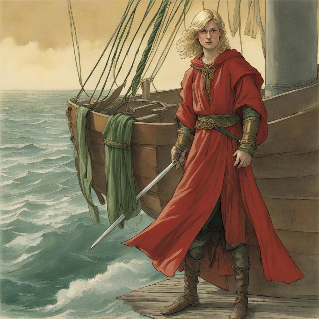 Передний корабль, чуть не дойдя до берега остановился перед королевским войском. На нос вышел молодой статный мужчина, с кудрявой светлой бородой. Он носил кольчугу и высокий шлем, за его спиной трепетал на ветру синий плащ