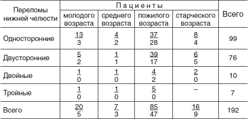 При этом односторонние переломы нижней челюсти были диагностированы у 77 больных, двусторонние – у 67, двойные – у 8, тройной – у 5 пациентов. Распределение больных по нозологическим формам переломов и полу в возрастных группах представлено в таблице 1.