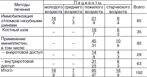 Учитывали также характер сопутствующей и фоновой патологии у пациентов разных возрастных групп. Пациенты пожилого и старческого возраста страдали тремя и более сопутствующими заболеваниями, что требовало внимания при проведении лечения переломов нижней челюсти, а также наблюдения врачами-специалистами в зависимости от особенностей сопутствующей или фоновой патологии.