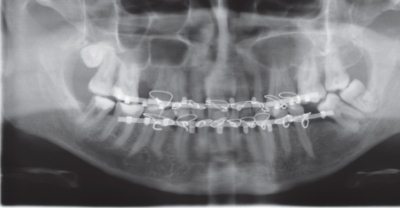 Проволочные шины изготавливали из алюминиевой проволоки индивидуально, припасовывая в полости рта, и фиксировали к каждому имеющемуся зубу бронзово-алюминиевой лигатурой. Ленточные шины изгибали по зубной дуге пациента и фиксировали к зубам бронзовоалюминиевой лигатурой. При смещении отломков накладывали межчелюстную резиновую тягу. После восстановления прикуса с помощью резиновых колец осуществляли межчелюстную фиксацию отломков в правильном положении (рис. 4).