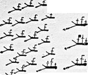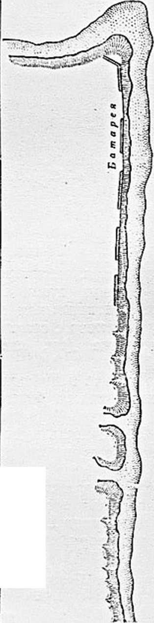 Схема 5. Турецкий флот на якоре у мыса Калкакрни. Внезапное нападение русского флота в походном строю трёх колонн со стороны берега, несмотря на сильный огонь турецкой
