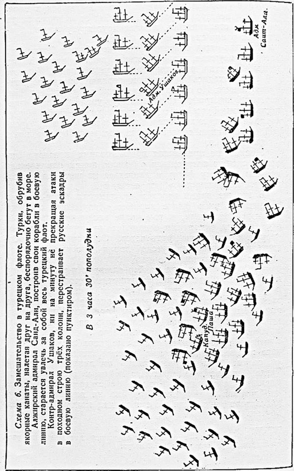 Ушаков, не прекращая преследования, приказал сигналом спешно построиться в боевую линию параллельно неприятельскому флоту и двигаться на него «со всевозможной поспешностью» (см. схему 6).