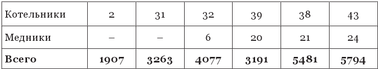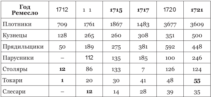 [Закрыть]. За 1715 г. и 1721 гг. из общего числа нами вычтены соответственно 12 и 20 живописцев. Между 1712 и 1721 гг., по отдельным ремеслам, количество плотников увеличивается с 709 до 3609 человек, кузнецов – со 128 до 500 человек, столяров – с 12 до 124 человек, токарей – с 1 до 55 человек, слесарей – с 0 до 35 человек, котельников – с 2 до 43 человек, медников – с 0 до 24 человек (см. таб. 1).