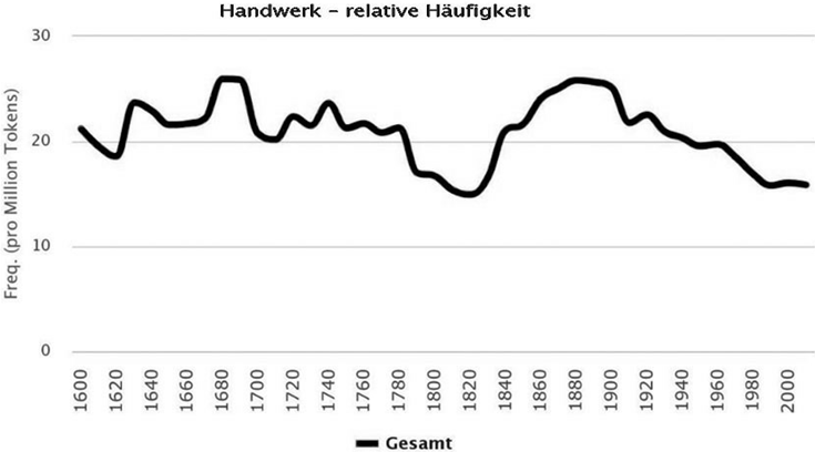 [Закрыть] в 1600–2000 гг. составляет 16,80 и коррелирует с развитием немецкого ремесла и промышленности. В XVII в. наблюдается стабильный рост частотности его употребления с 21.20 (32 упоминания в абсолютных числах) до 25.86 токенов (100 упоминаний) (+4.66 токена) (1600–1699). К началу XVIII в. число несколько снижается до 20.76 (95 упоминаний) и к концу века опускается до 17.00 токенов (154 упоминания) (–3.76 токена) (1700–1799), но показательно, что до 1789 г. число токенов «ремесла» в 21.28 (150 упоминаний) остается стабильным. После 1789 г., видимо из–за эпохи политической нестабильности и войн в Европе и роста влияния мануфактур, наступает статистическое снижение и стагнирование слова «ремесло», продолжавшееся до конца 1830–х гг. (14,94 токена и 43 упоминания). С началом промышленного переворота 1840–х гг. и последовавшей индустриальной революцией в Германии частотность упоминаний c 1800 до 1899 г. значительно возрастает с 16.70 до 25.81 токенов (+9.11)377377