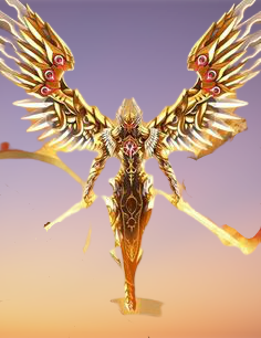 Это оказалась фигура в странном доспехе. На вид кожаные части, сшитые в единый костюм, были прикрыты металлической броней в районе груди, рук и ног, создавая ещё один слой защиты. Шлем был глухой и не имел никаких рисунков, и только по бокам были видны небольшие крылышки, созданные будто из белых костей. На костюме были заметны целые грозди драгоценных камней, которые создавали необычные рисунки на частях брони рыцаря. За спиной у рыцаря были сложены два крыла всё из таких же частей металла и кристаллов. Часть тела рыцаря закрывали небольшие силовые щиты, которые позволяли ему игнорировать давление воздуха. Также, присмотревшись, можно было заметить висящие в воздухе печати, которые переливались золотым блеском, как, собственно, и весь костюм. Большего рассмотреть Симонов не успел, услышав в переговорном устройстве спокойный голос: