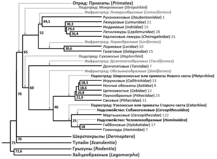 Генеалогическое дерево современных семейств приматов, а также родственных им отрядов млекопитающих