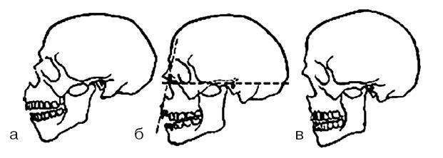 Типы черепов с разной вертикальной профилировкой: а – прогнатический тип черепа; б – мезогнатический тип черепа; в – ортогнатический тип черепа.