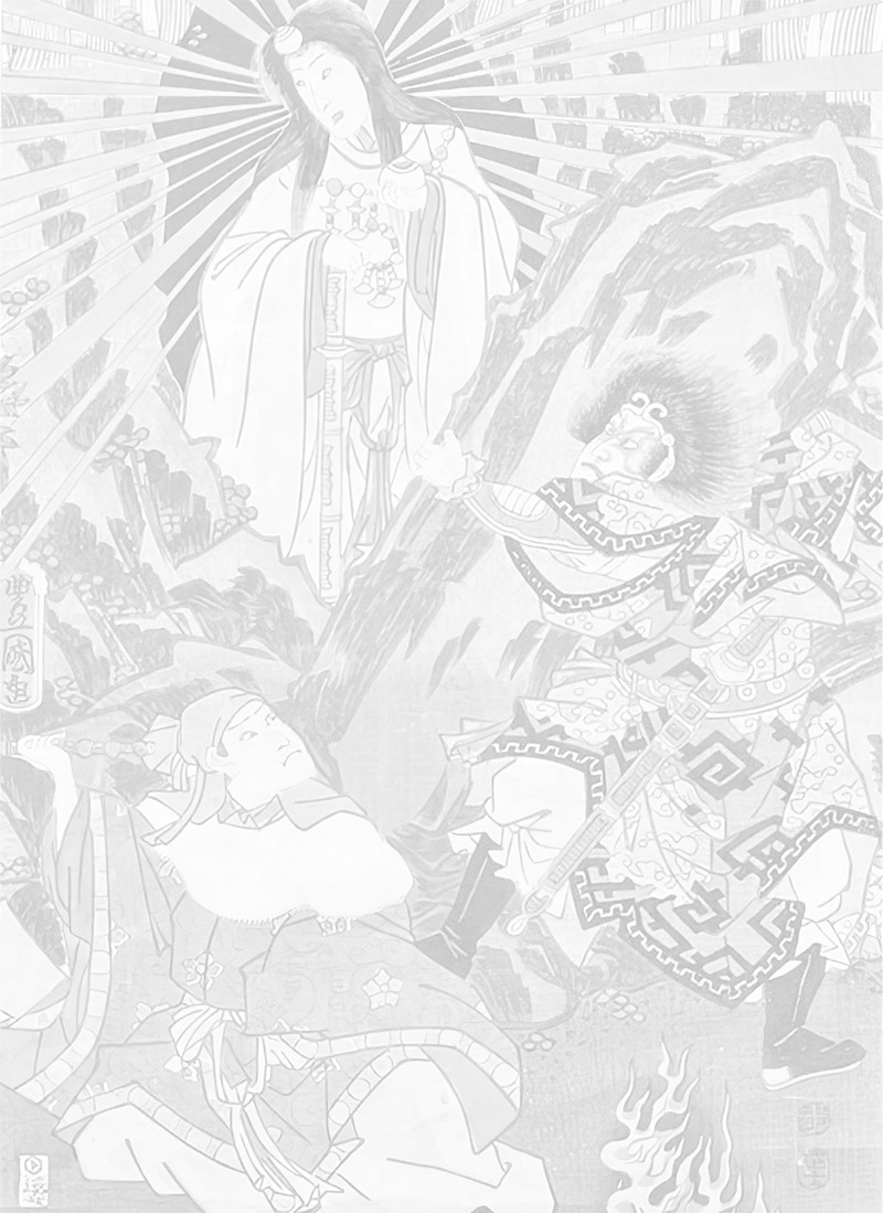 Аматэрасу-о-МикамиПрародителями всего сущего были первый мужчина Идзанаги и первая женщина Идзанами. После смерти Идзанами Идзанаги попытался вернуть ее из Ёми-но куни, царства мертвых, где царил вечный мрак, но попытка оказалась неудачной. После возвращения из Ёми, Идзанаги пришлось совершить ряд омовений для того, чтобы очиститься от скверны. Из капель воды, которой Идзанаги омыл свой левый глаз, родилась богиня Солнца Аматэрасу, из капель воды, которой был омыт правый глаз, родился бог Луны и ночи Цукиёми, а из капель воды, употребленной для омывания носа, родился бог ветра и водных стихий Сусаноо (Такэхая Сусаноо-но Микото).