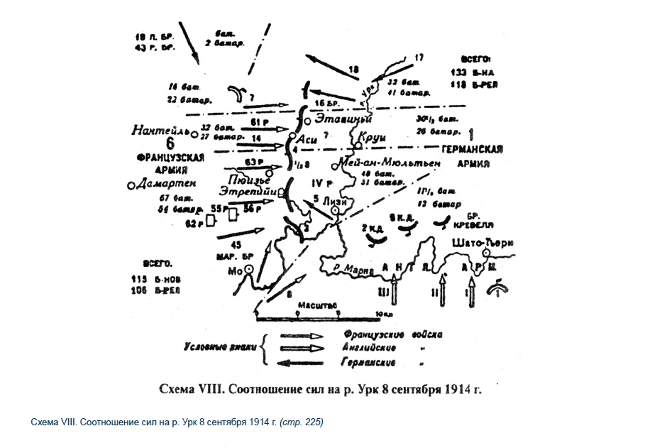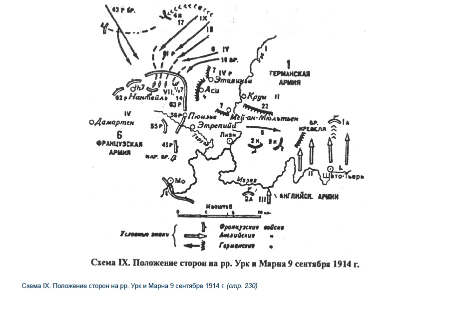 На фронте 1-й германской армии рано утром 9 сентября началось наступление правым флангом на Нантейль и развивалось успешно, но левому флангу армии Клука пришлось уже иметь дело с англичанами и французами, выходившими на правый берег р. Марна в промежутке между 1-й и 2-й германскими армиями, на участке между Шато-Тьери и устьем р. Урк; переправы здесь оказались не разрушенными германцами. В связи с этим положением Клук приказал левому флангу загнуться на левый берег р. Урк фронтом на юг (схема IX). [230]