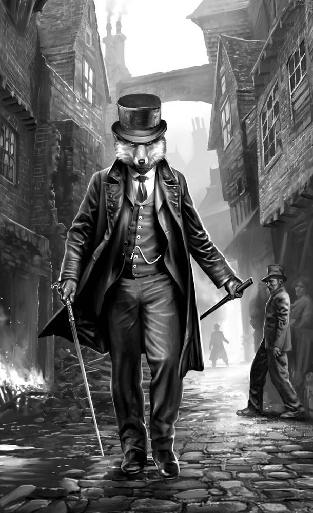 Краем глаза я увидел довольно высокого, под шесть футов, рыжего лиса, в модном цилиндре, хорошем костюме, кожаном плаще, с тяжёлой тростью в лапах.