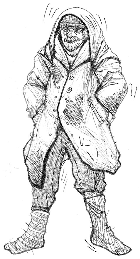Пока ждал такси, из-за угла вырулила знакомая колченогая фигура в носках и шинели.