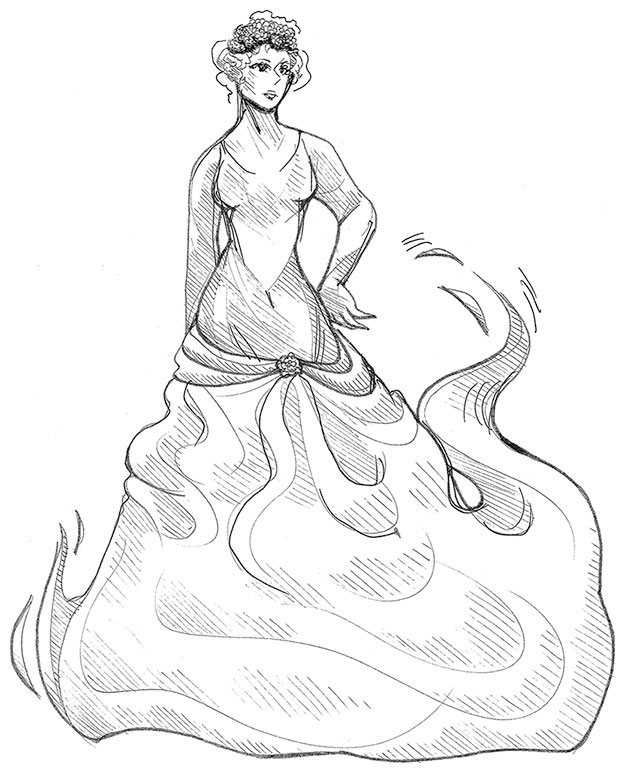 Когда девушка вышла нам навстречу, мы оба, прислонившись к стене у входа в ванную, задумчиво насвистывали, рассеянно глядя в потолок. Нонна почему-то выбрала голубое атласное платье конца девятнадцатого века, в талию, с широким подолом и весьма скромным декольте. Это было неожиданно и впечатляюще…